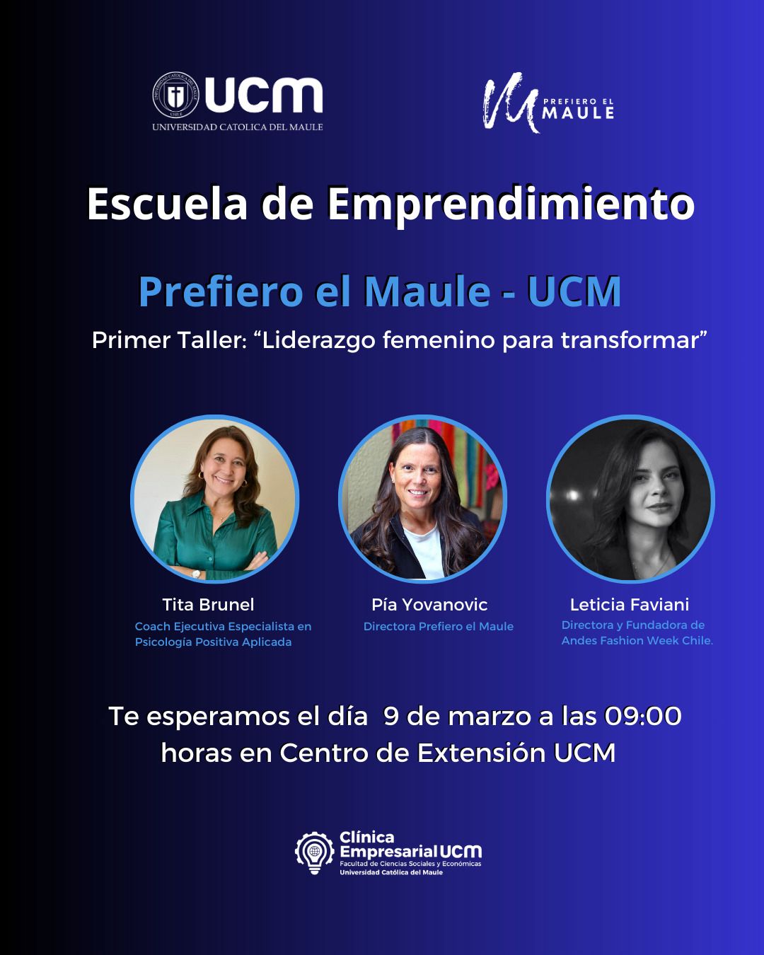 La actividad contará con la participación de destacadas expositoras como Tita Brunel, coach ejecutiva especialista en Psicología Positiva Aplicada; Pía Yovanovic, directora de Prefiero el Maule y líder de la Red Mujeres Latinoamericanas, con una destacada trayectoria en liderazgo femenino y apoyo a emprendimientos con impacto territorial; y Leticia Faviani, directora y fundadora de Andes Fashion Week Chile.
