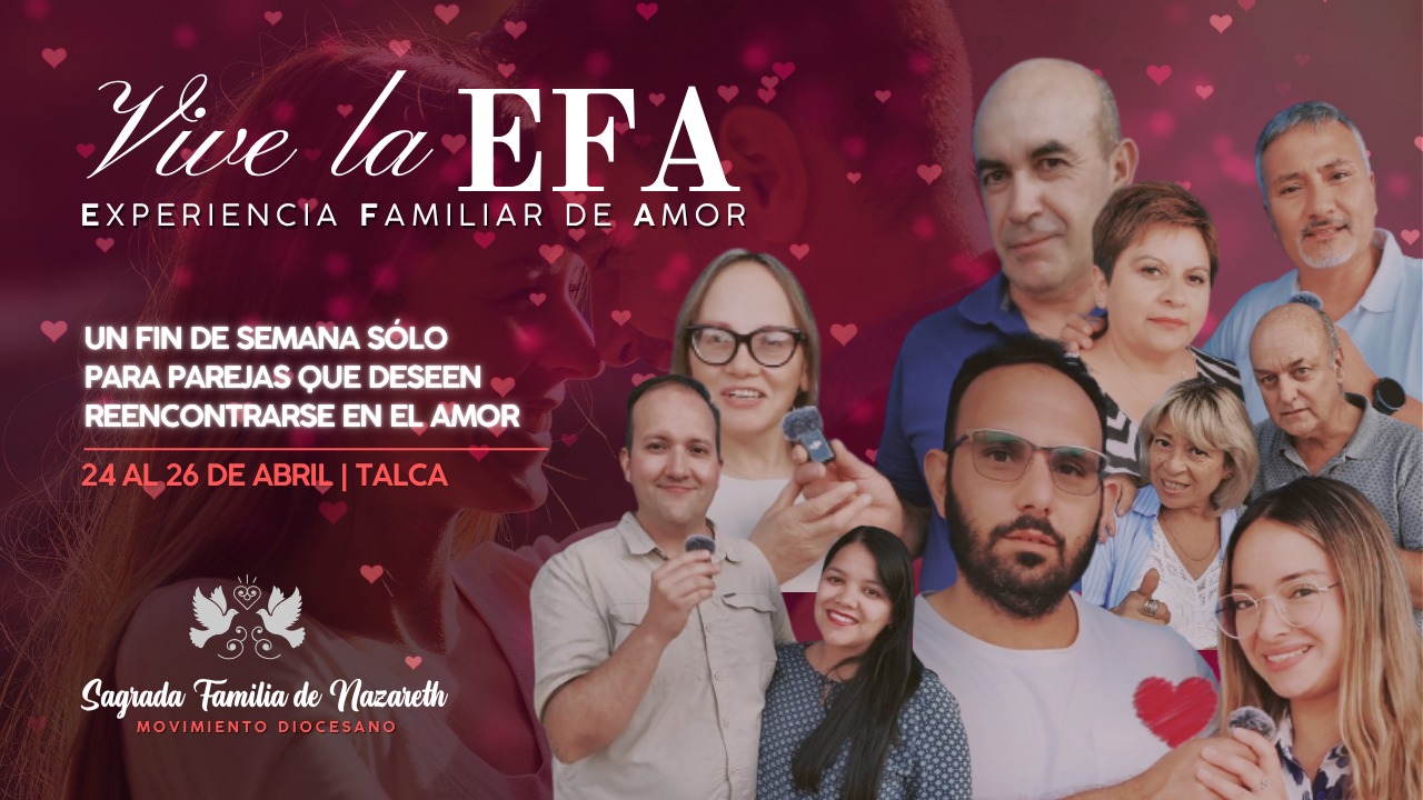 La EFA es un retiro de fin de semana diseñado para parejas estables con más de 3 años conviviendo juntos, no necesariamente casados por la iglesia. El único requisito es AMARSE PARA SIEMPRE. En cada jornada convergen más de 60 parejas con un objetivo común: robustecer su relación a través de la fe y el compromiso mutuo. Con esta próxima edición, el encuentro cumple ya seis años de trayectoria en la Diócesis de Talca.