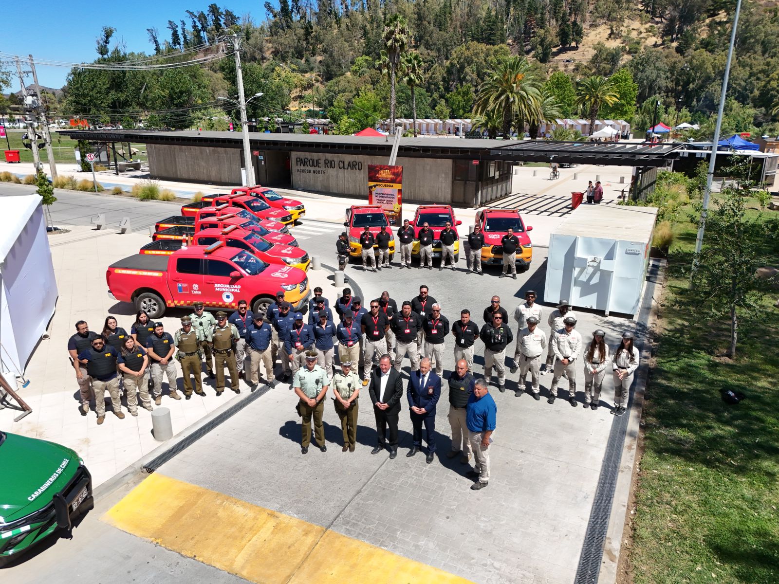 En el acceso norte del Parque Río Claro, el alcalde de Talca anunció este viernes el amplio plan de seguridad dispuesto para la Fiesta de la Independencia, actividad que se desarrollará durante este viernes 13, sábado 14 y domingo 15. El anuncio se realizó frente a un importante contingente compuesto por vehículos y personal de Seguridad Municipal, guardias privados, guardaparques, Carabineros y funcionarios de la Policía de Investigaciones, quienes estarán desplegados durante todo el evento.