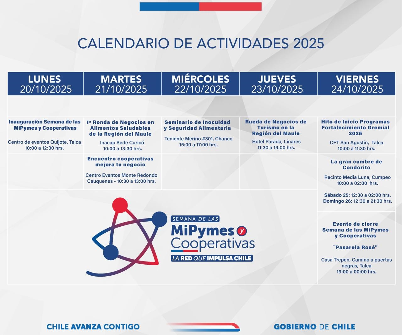 La Semana de las Mipymes y Cooperativas 2025 se extenderá hasta el viernes 24 de octubre, con diversas actividades en toda la región. El calendario completo puede consultarse en las redes sociales de Sercotec, los Centros de Desarrollo de Negocios y los servicios dependientes del Ministerio de Economía.