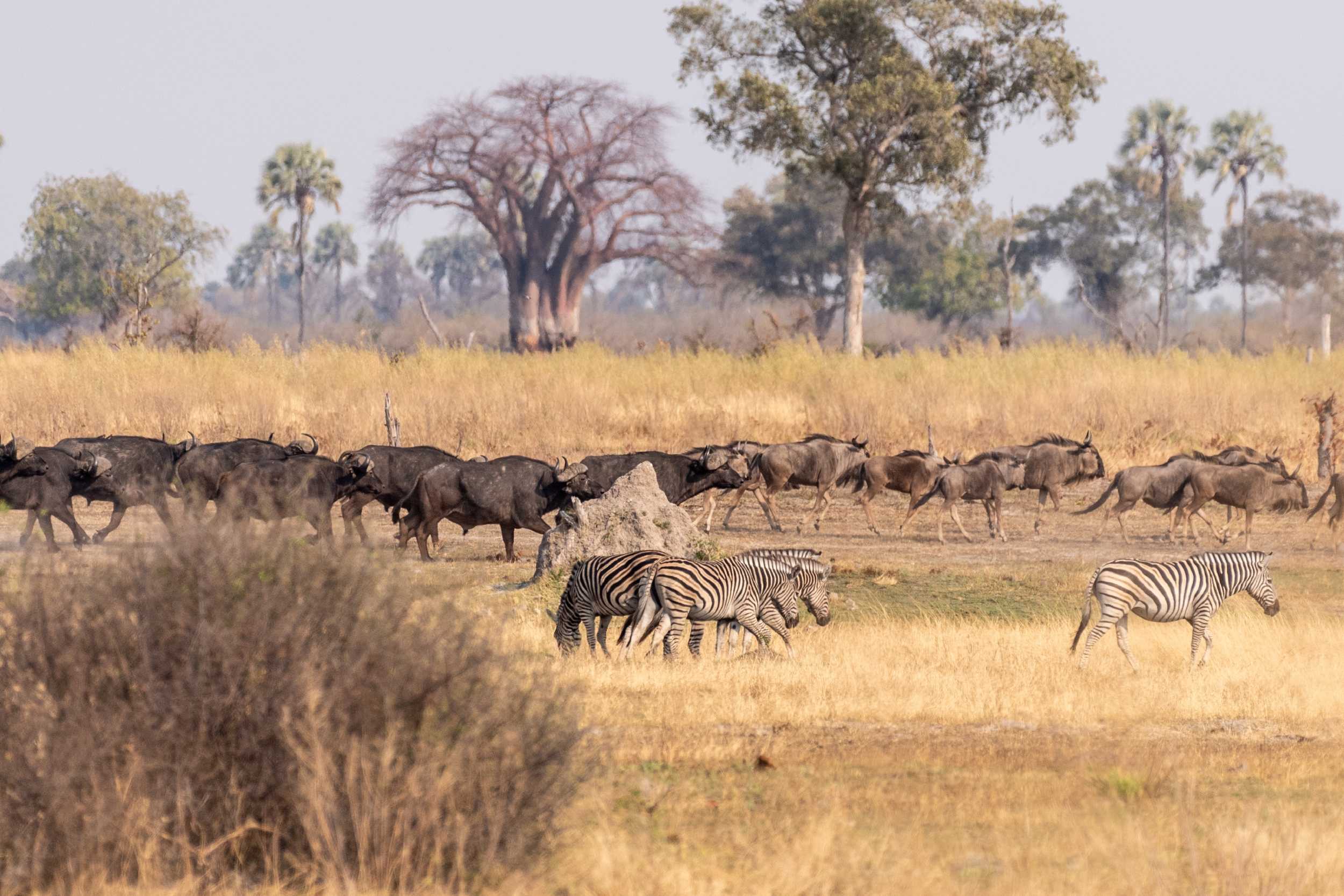 Telephoto shot of a herd of blue wildebeest - Connochaetes taurinus- and Burchell's Plains zebra -Equus quagga burchelli-walking on the plains of the Okavango Delta, Botswana.