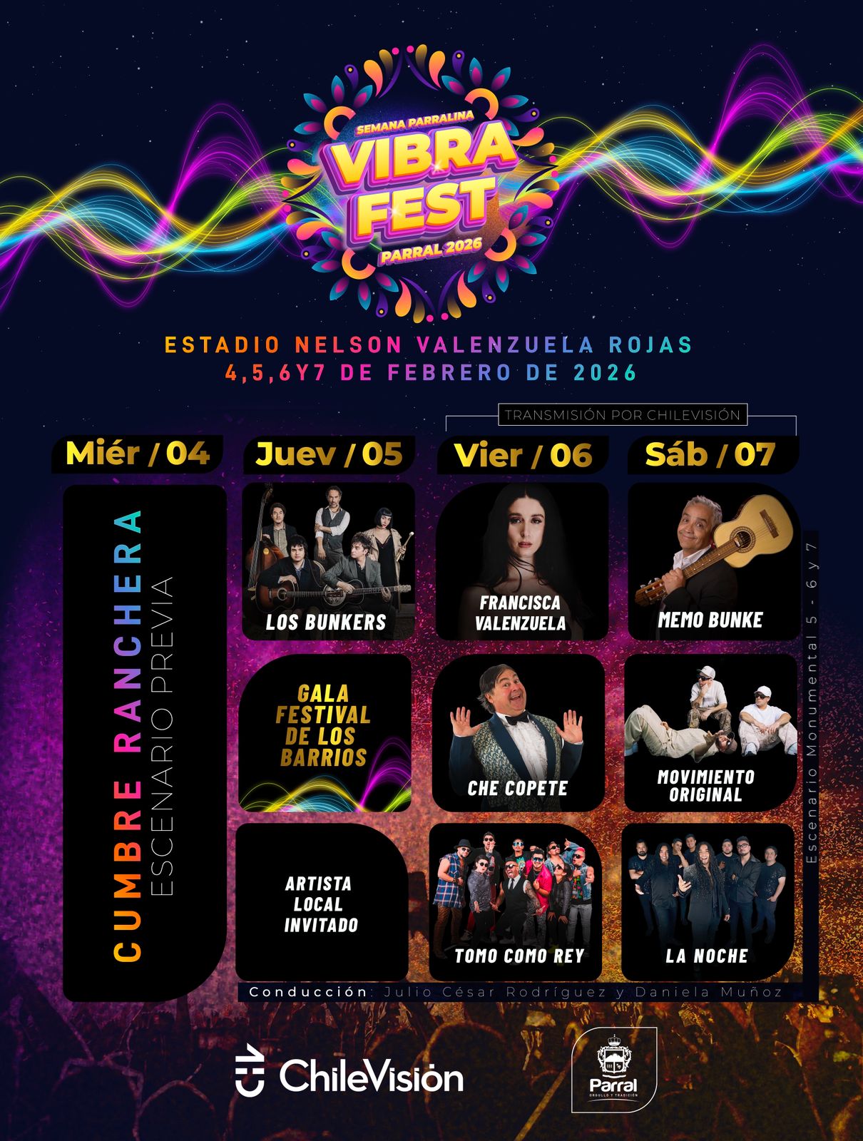 La Municipalidad de Parral informa a la comunidad la realización del Vibra Fest – Semana Parralina 2026, evento artístico, cultural y familiar que se desarrollará entre los días miércoles 4 y sábado 7 de febrero, con una destacada parrilla de artistas nacionales y locales, además de una variada oferta recreativa pensada para todo público.