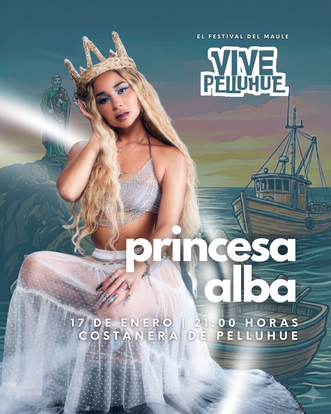 Compartiendo el protagonismo de la noche, Princesa Alba aterrizará en Pelluhue con todo el glamour y estilo que la caracterizan. La artista, consolidada como un ícono del pop, presentará un espectáculo visual y sonoro de nivel internacional, repasando éxitos como “Convéncete” y “Ya no quieres quererme”, asegurando que la fiesta sea total.