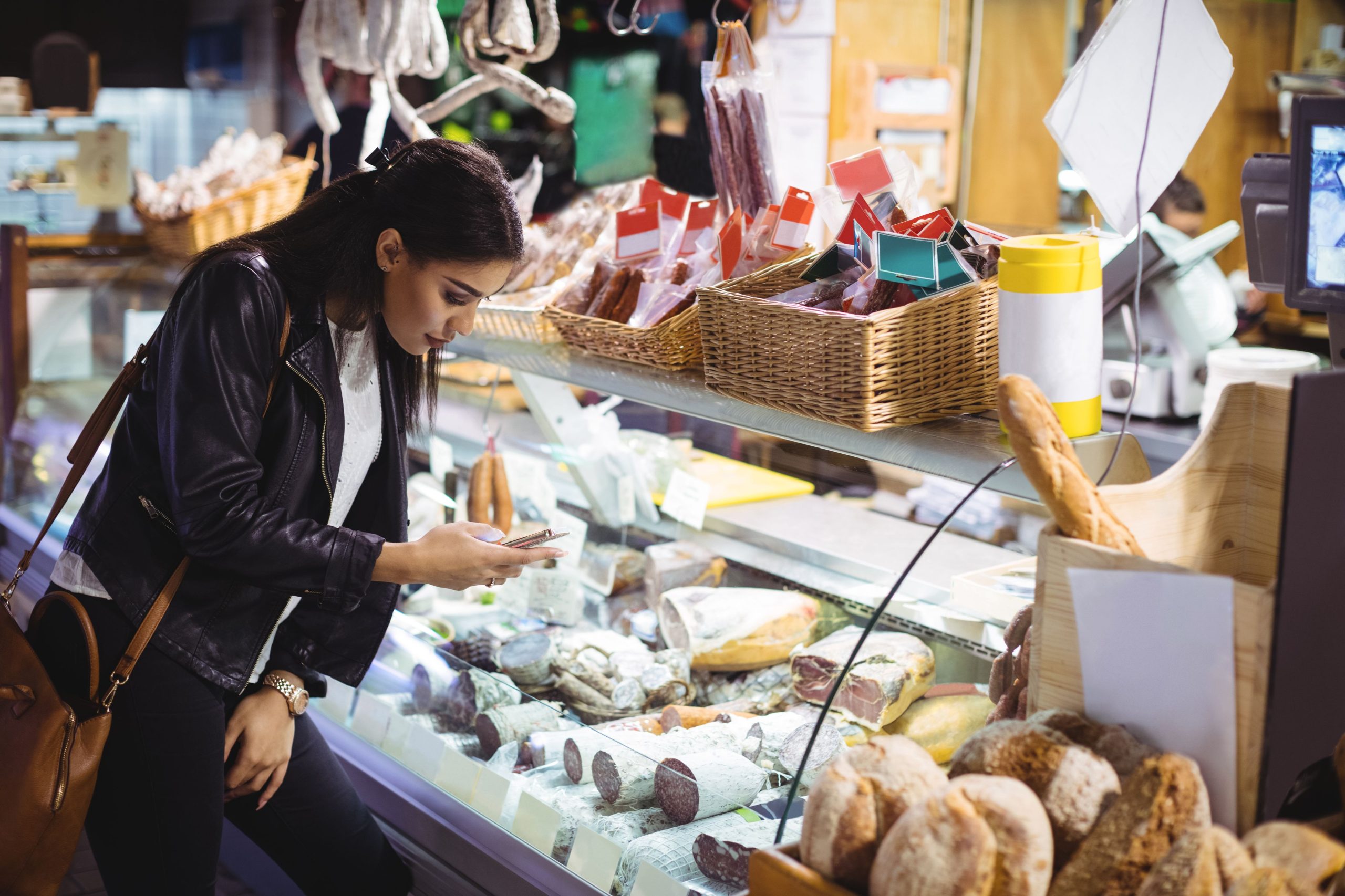Woman using mobile phone while looking at food display in supermarket