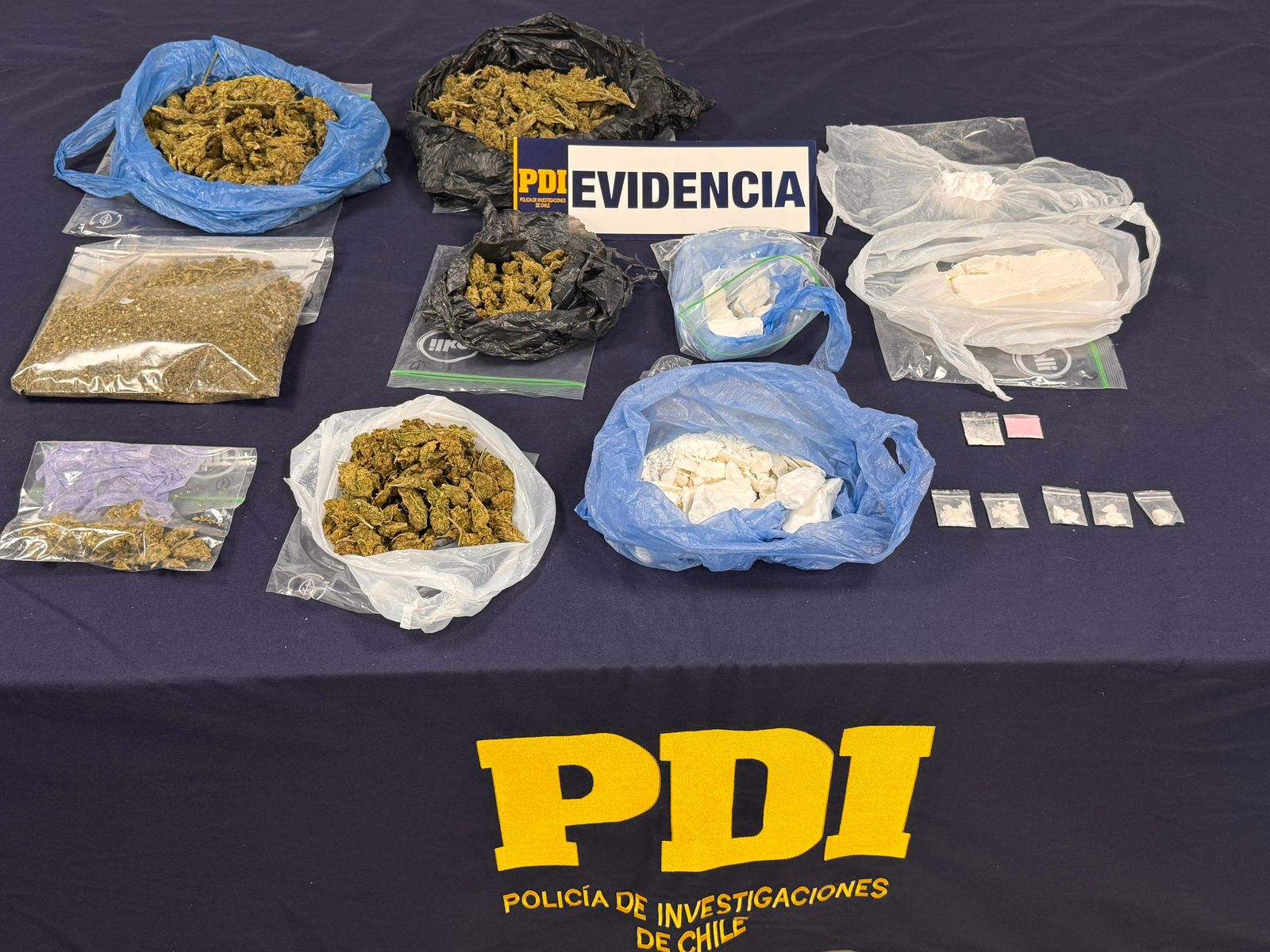 Las diligencias incluyeron allanamientos en tres inmuebles, entre ellos un prostíbulo, siendo detenidas Francisca Elena Villagrán Raihuaque (23) y Jeanette Marcela Lara Pérez (42). Además, se incautaron más de dos kilos de droga entre ketamina, cannabis sativa y cocaína.