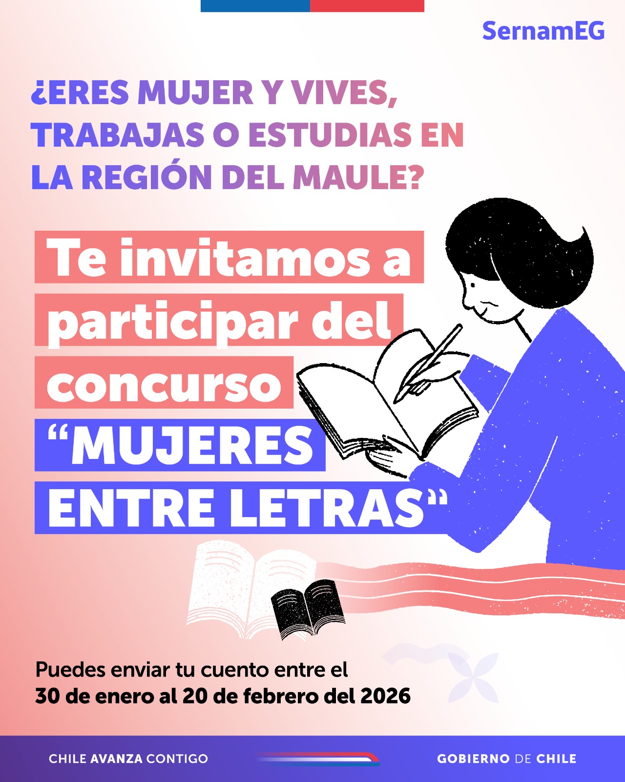 En el marco de la conmemoración del “Mes de la Mujer”, la dirección regional del Servicio Nacional de la Mujer y la Equidad de Género (SernamEG Maule), está invitando a las mujeres del territorio maulino a participar en la segunda versión del Concurso Literario “Mujeres Entre Letras”, una convocatoria que busca visibilizar, y difundir la escritura femenina a través del cuento en cien palabras.