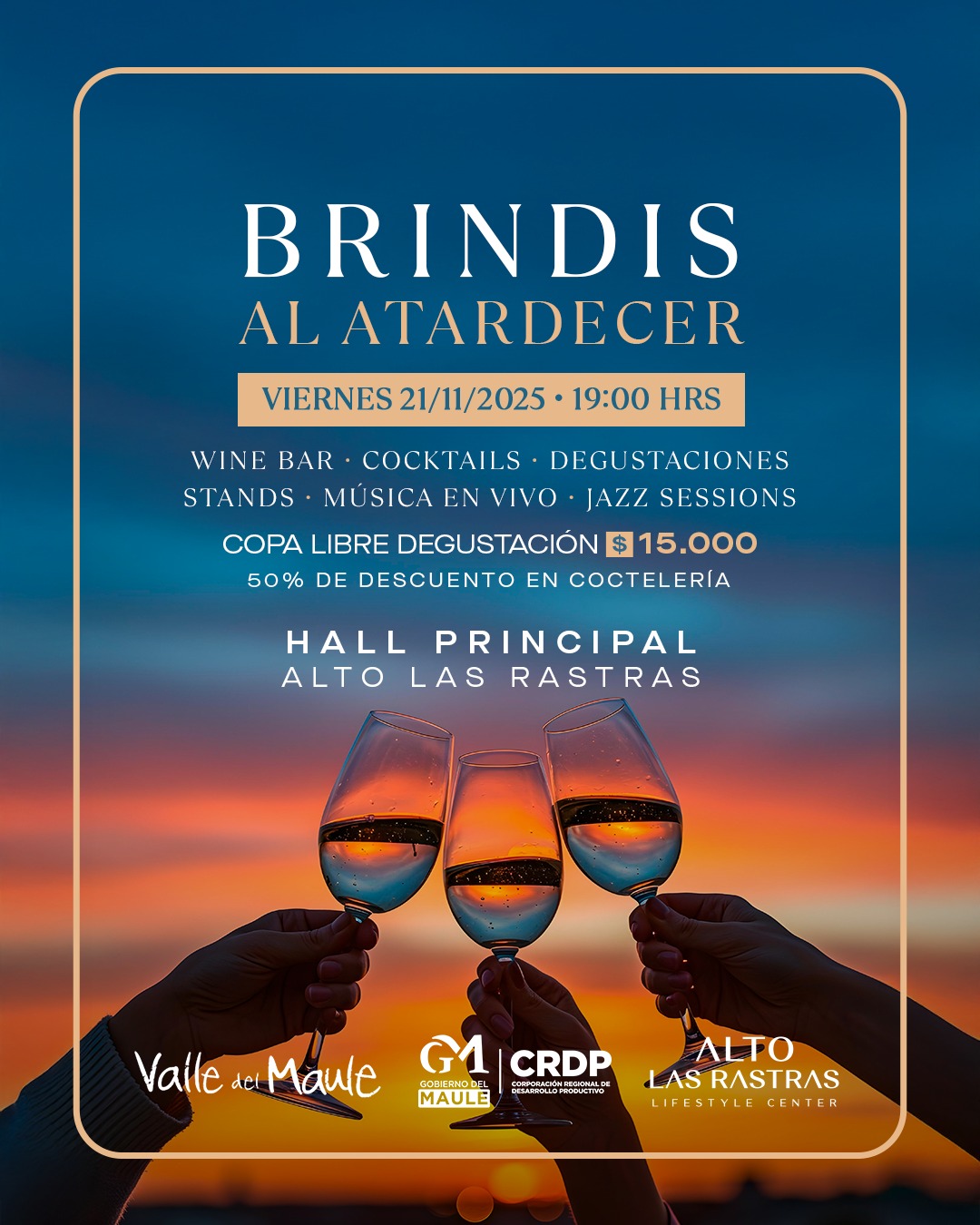 Este viernes 21 de noviembre, a partir de las 19:00 horas, el Hall Principal de Alto Las Rastras, Lifestyle Center, será sede de “Brindis al Atardecer”, un encuentro creado para destacar lo mejor del Maule, con especial énfasis en sus espumantes, sin dejar de lado una cuidada selección de vinos provenientes de diversas viñas de la región.