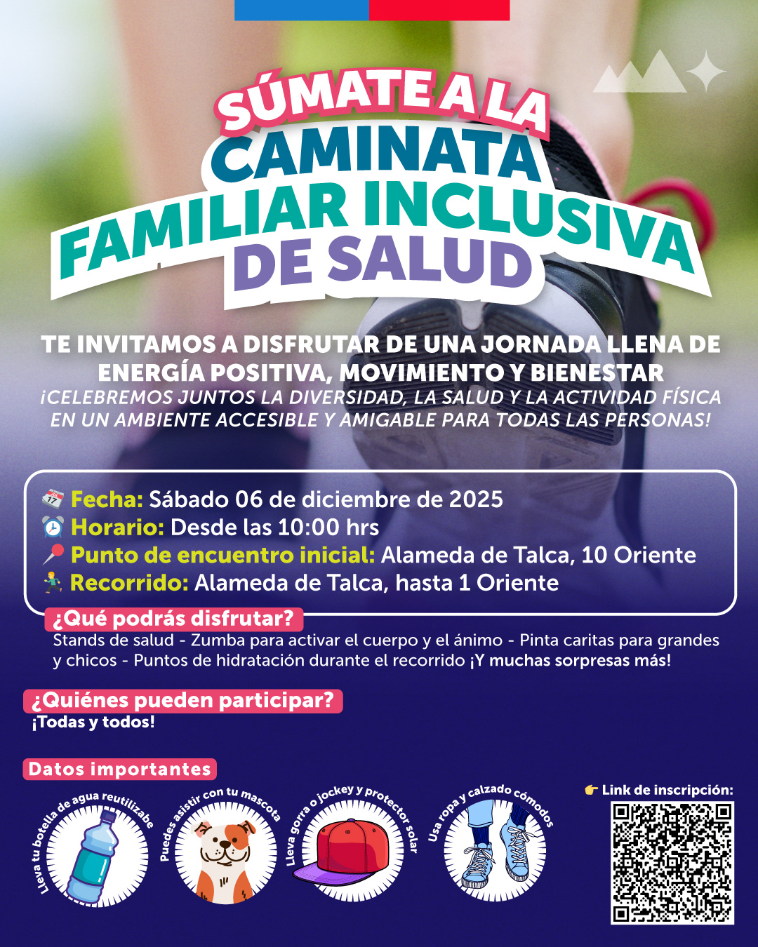 Con esta caminata, el Servicio de Salud Maule reafirma su compromiso con la inclusión, la equidad y el bienestar de las comunidades, invitando a las familias del territorio a vivir una mañana de actividad física, energía positiva y encuentro comunitario.