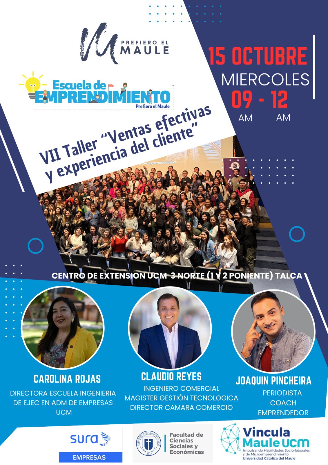 Este taller es organizado por Prefiero el Maule, en alianza con la Universidad Católica del Maule, a través de su programa Vincula Maule UCM y la Facultad de Ciencias Sociales y Económicas, con el apoyo de SURA Empresas.